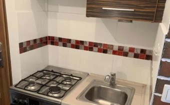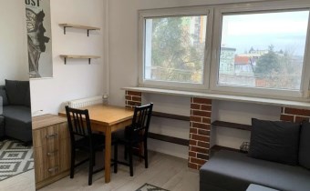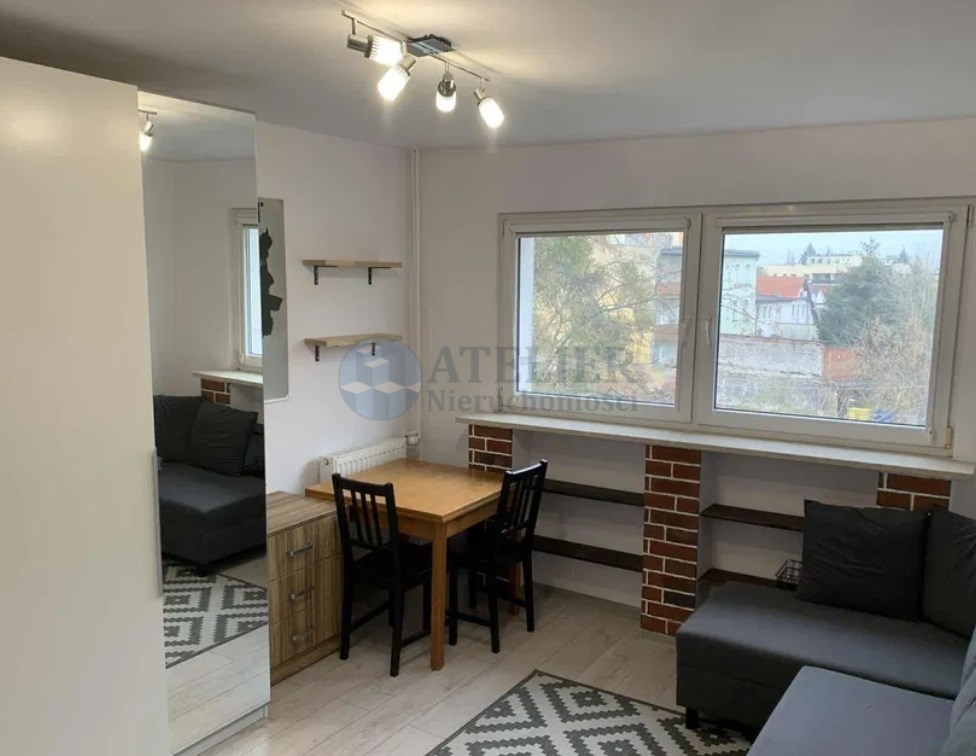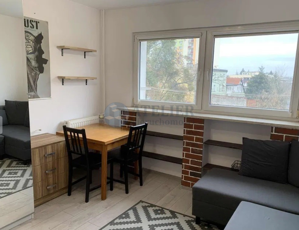 Funkcjonalny układ: pokój dzienny z dużymi oknami i narożną sofą, aneks kuchenny (kuchenka gazowa z piekarnikiem, lodówka, mikrofalówka), łazienka z kabiną prysznicową i pralką. Industrialne akcenty z cegłą nadają wnętrzu charakteru.