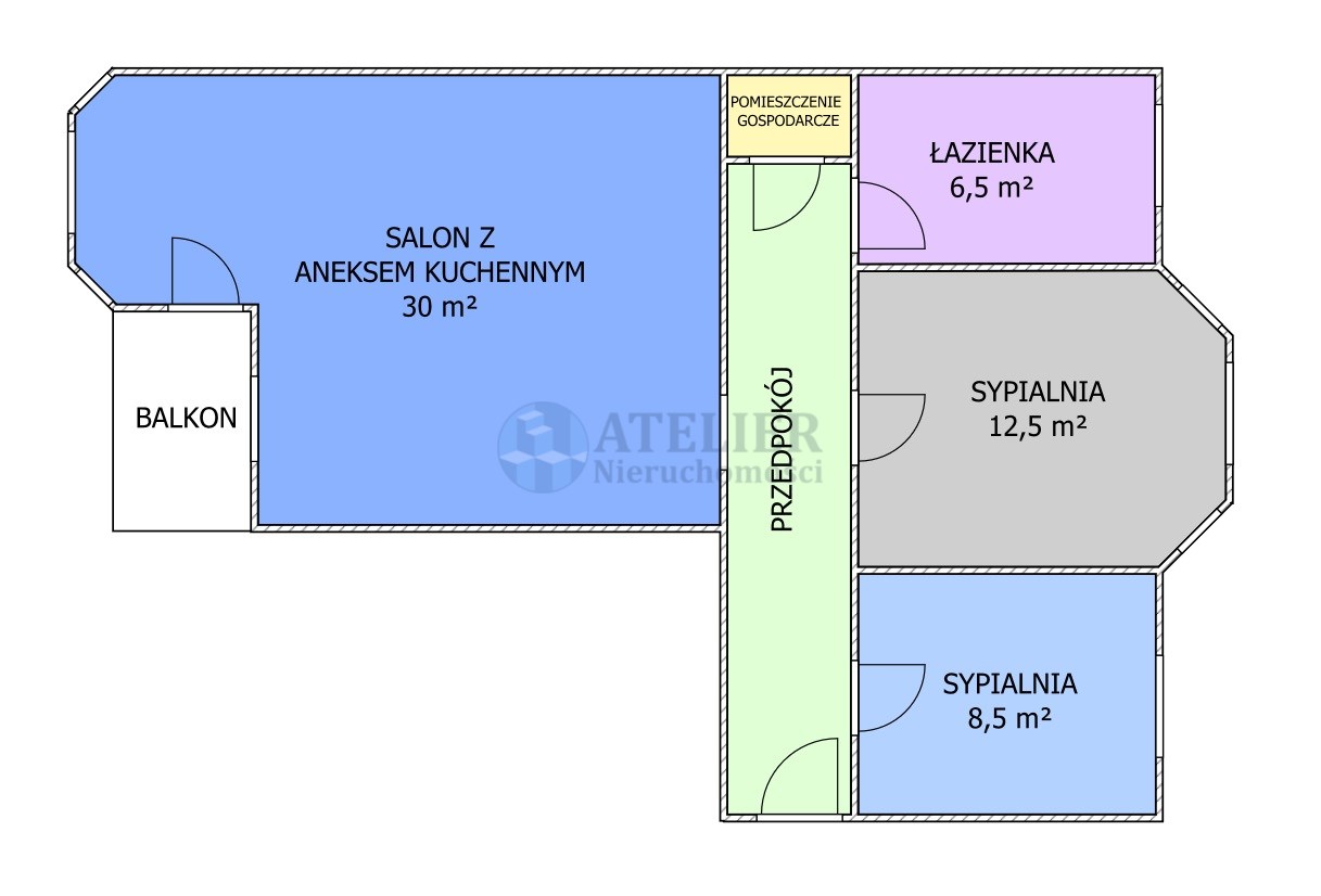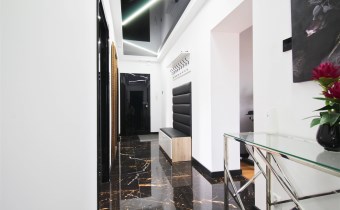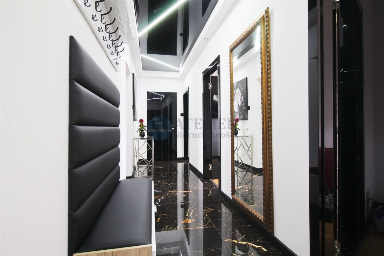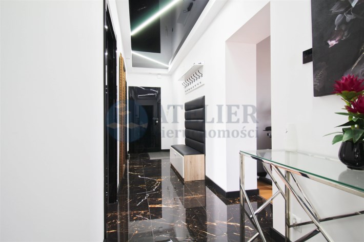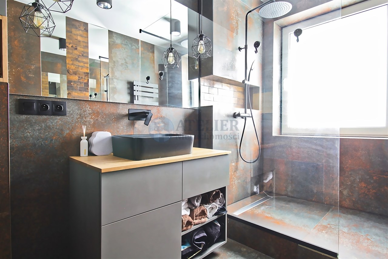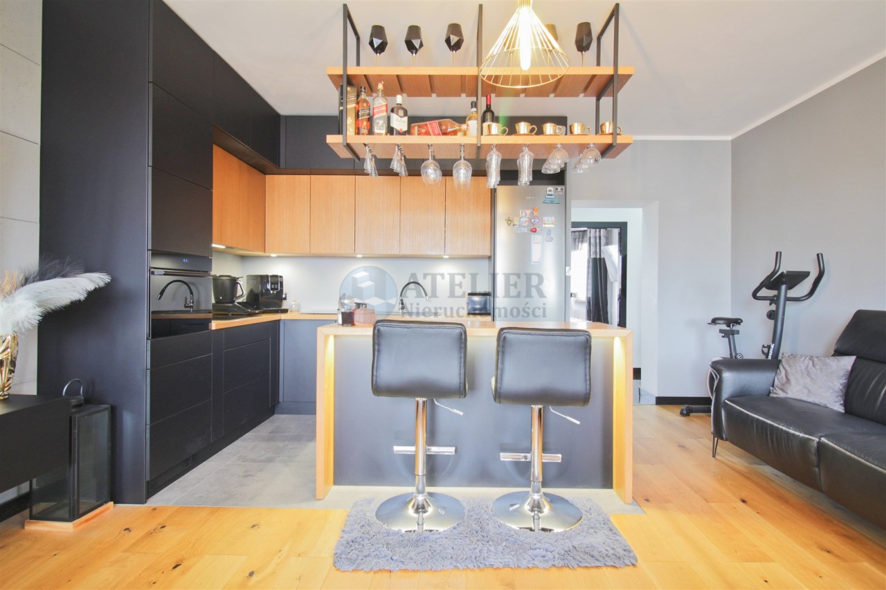Mieszkanie oferuje również dwie sypialnie, nowoczesną łazienkę z kabiną typu walk-in oraz praktyczne pomieszczenie gospodarcze, które znacząco zwiększa funkcjonalność przestrzeni. W przedpokoju zastosowano napinany sufit, który stanowi ciekawy akcent wizualny i podnosi standard wykończenia. Dodatkowym atutem jest balkon, który jest przyjemnym miejscem do odpoczynku.