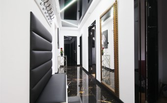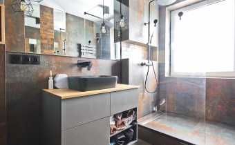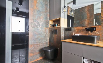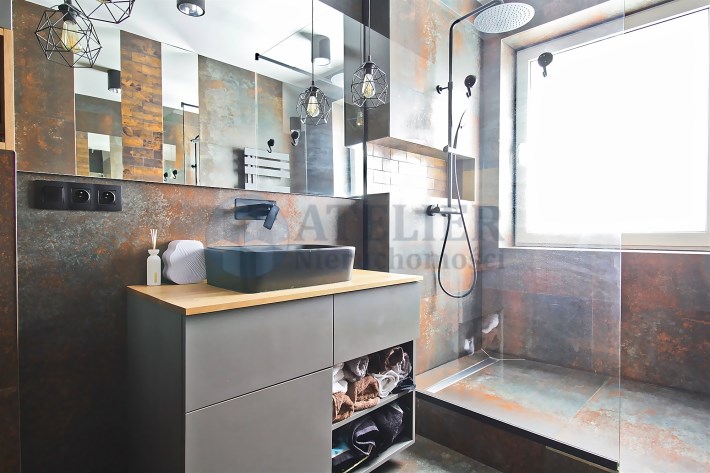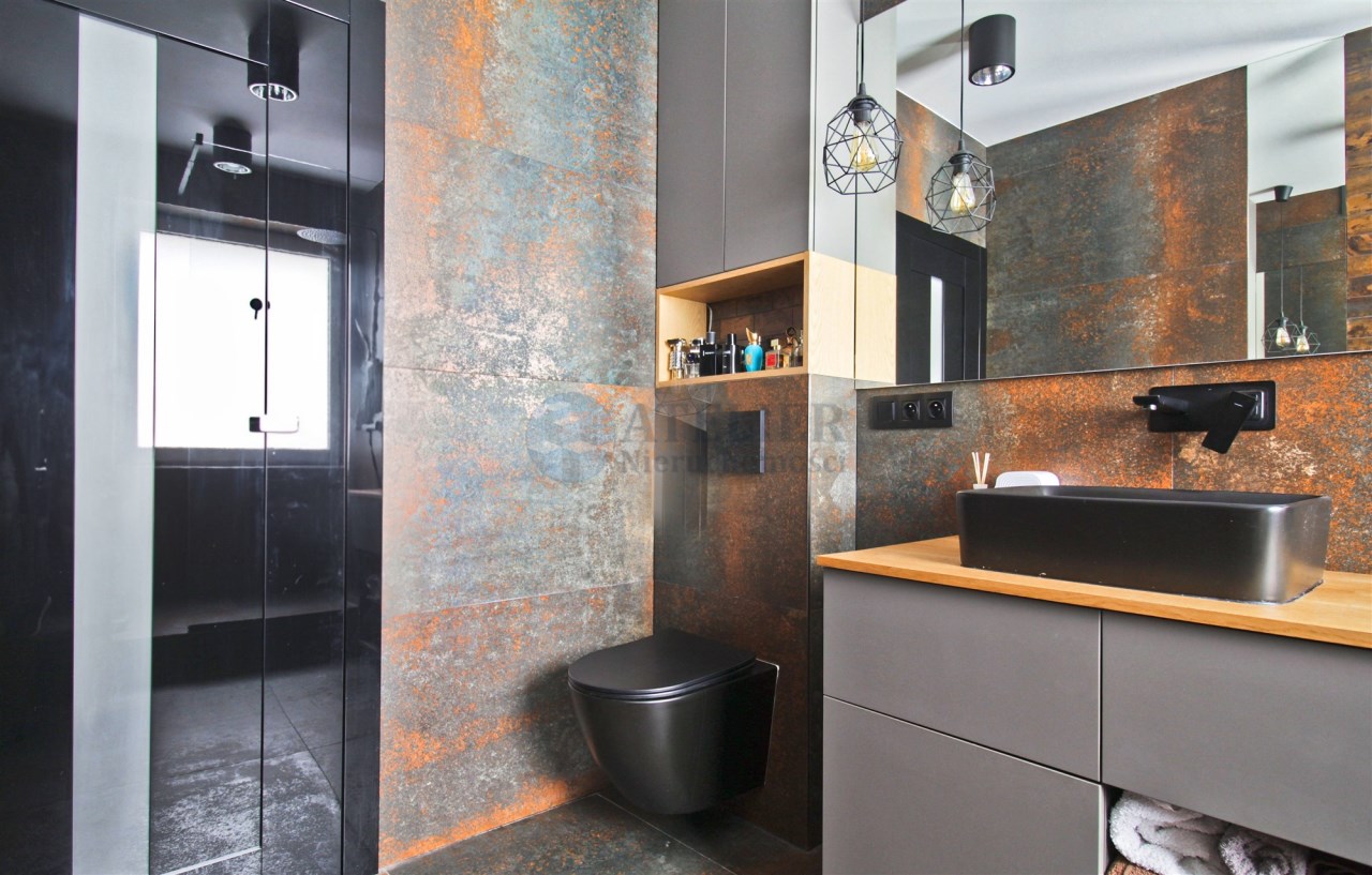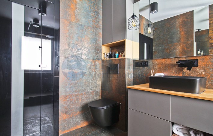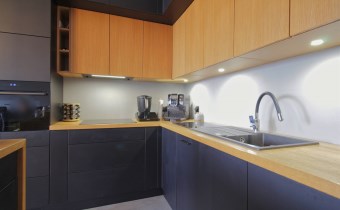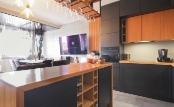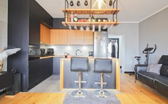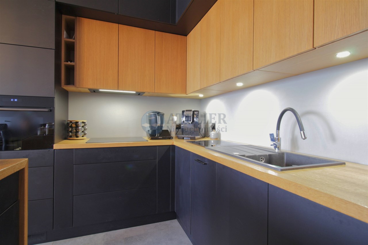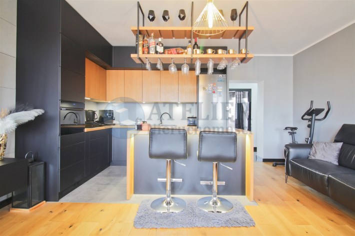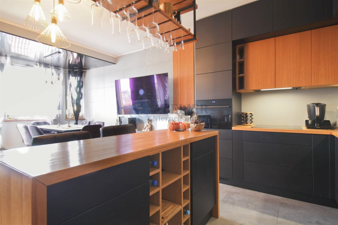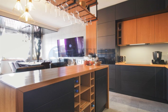 Centralną część mieszkania stanowi przestronny salon z aneksem kuchennym, który tworzy spójną i wygodną strefę dzienną. Zabudowa kuchenna została wykonana ze szczotkowanego drewna, co nadaje wnętrzu elegancki i ponadczasowy charakter. Całość została doinwestowana z wykorzystaniem wysokiej klasy materiałów, co widoczne jest zarówno w estetyce, jak i jakości wykończenia.